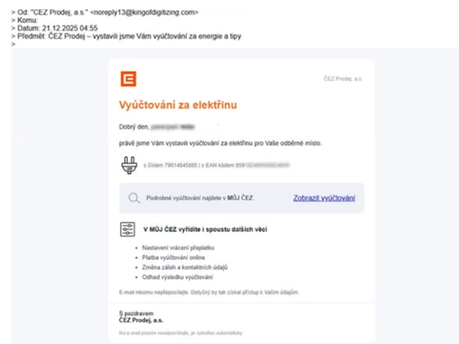 Podvodníci hledají nové a nové cesty, jak úspěšně působit v online prostoru. Stále ovšem využívají i e-maily. Aktuálně před nimi varuje největší energetické uskupení v České republice, skupina ČEZ. Podle jejího webu společnost eviduje větší množství případů podvodných e-mailů. Podvodníci se snaží, aby jejich elektronická pošta vypadala jako oficiální komunikace k vyúčtování. Je navíc poměrně těžce rozpoznatelná. Z klientů společnosti ČEZ se snaží vylákat citlivé údaje.