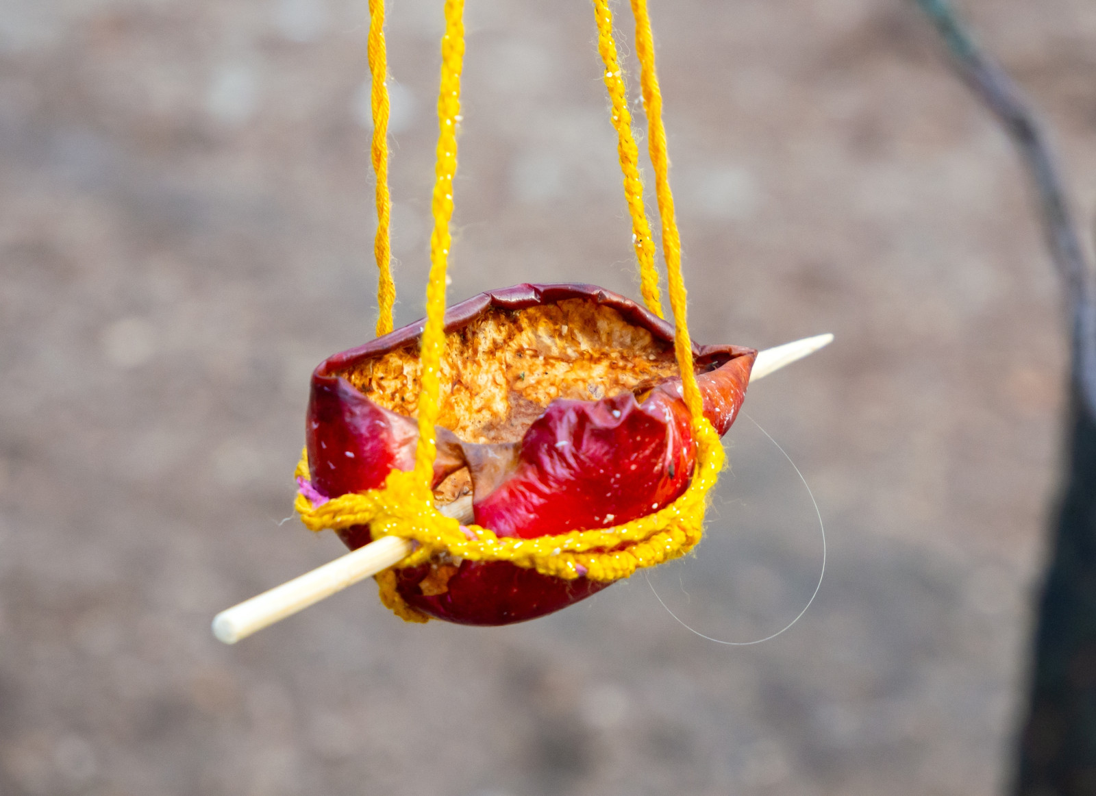 Takto připravené krmítko z jablka můžete například položit mezi větve na strom. Pokud navíc do jablíčka ze dvou stran zapíchnete dřívka či jiné pevné přírodniny a omotáte je provázkem, můžete krmítko kamkoliv zavěsit. Výhodou tohoto řešení je, že se jedná o 100% přírodní produkt, který se rychle rozloží.