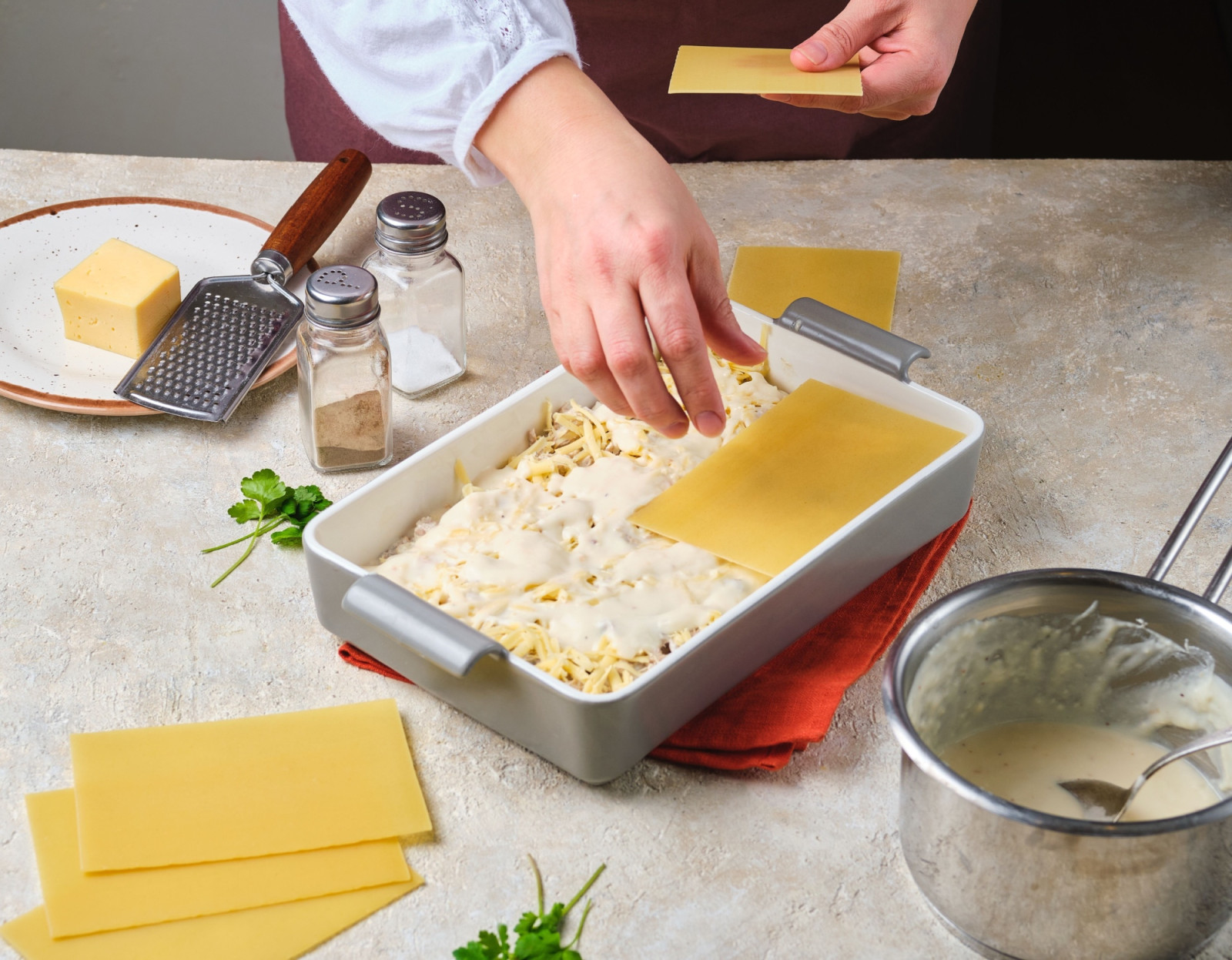 Nyní se pusťte do vrstvení lasagní. Do pekáče nejprve dejte trochu omáčky, poté lasagne a bešamel. Několikrát opakujte (podle velikosti pekáče).