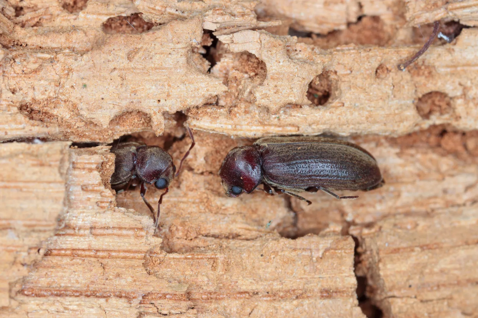 To, co se zvenku tváří jako drobná estetická vada, může být uvnitř vážný problém. Larvy červotoče vyžírají dřevo zevnitř a vytvářejí spletitou síť chodbiček, které oslabují jeho pevnost. Na dotek se pak dřevo může drolit, lámat nebo prasknout i pod tlakem prstu.