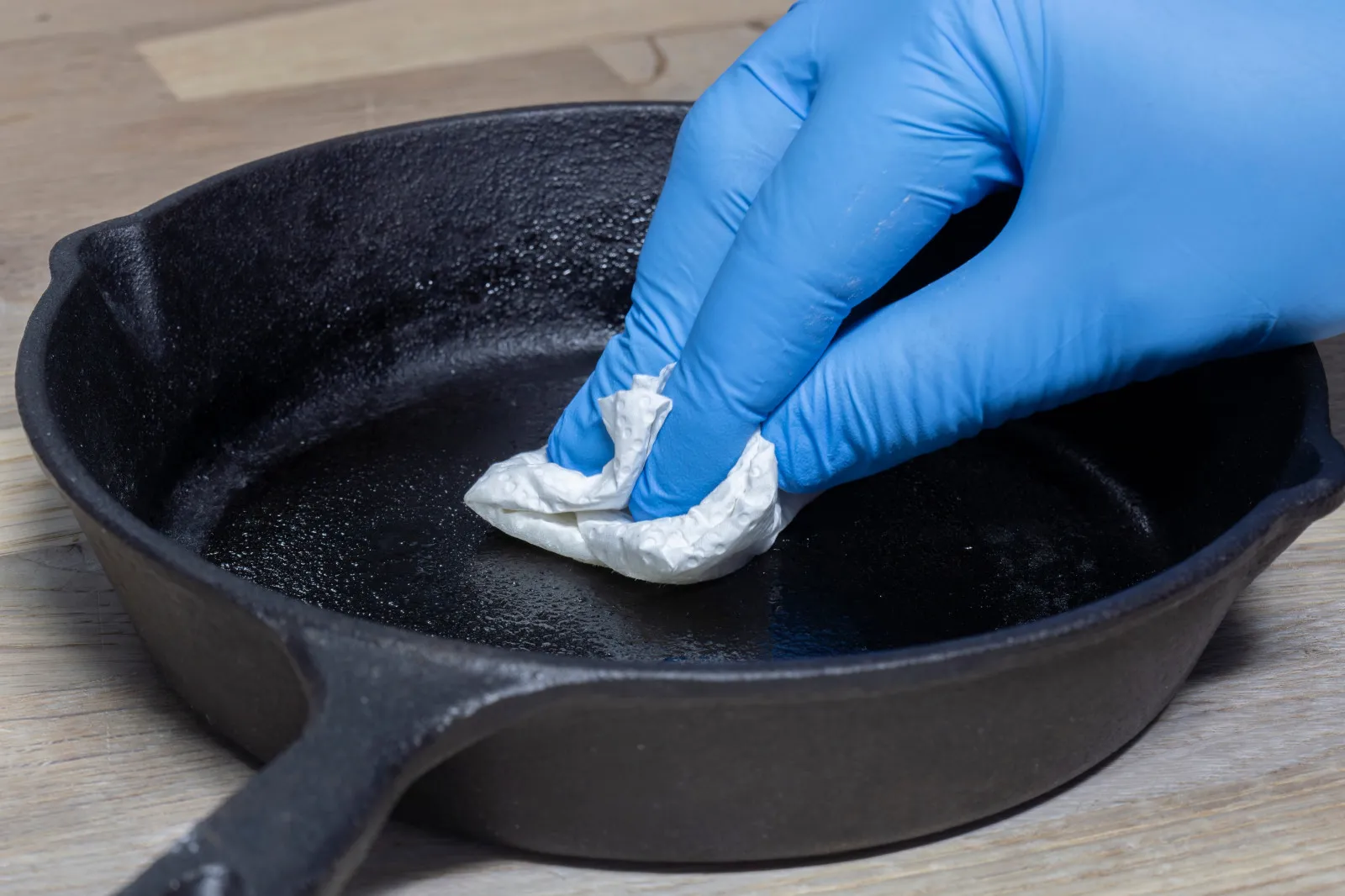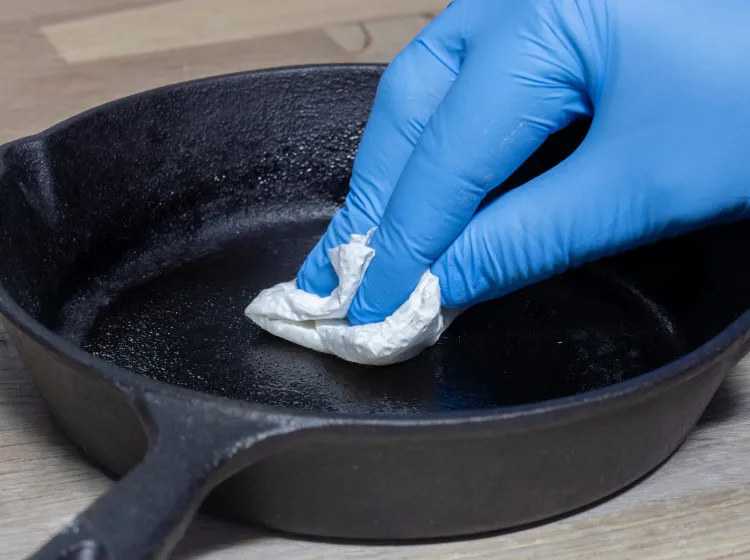 Pokud se na ní přesto něco připálí, dá se povrch vyčistit. Stačí nasypat hrubou sůl, mírně zahřát a papírovou utěrkou setřít nečistoty. Vlastnosti správně ošetřené pánve se s každým vařením zlepšují a její ochranná vrstva se dál posiluje.