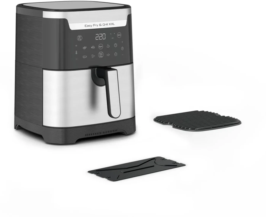 - Komponenty a příslušenství: vyjímatelná nádoba a napařovač pro ohřev zeleniny, fritovací koš, nepřilnavý povrch, digitální ovládání