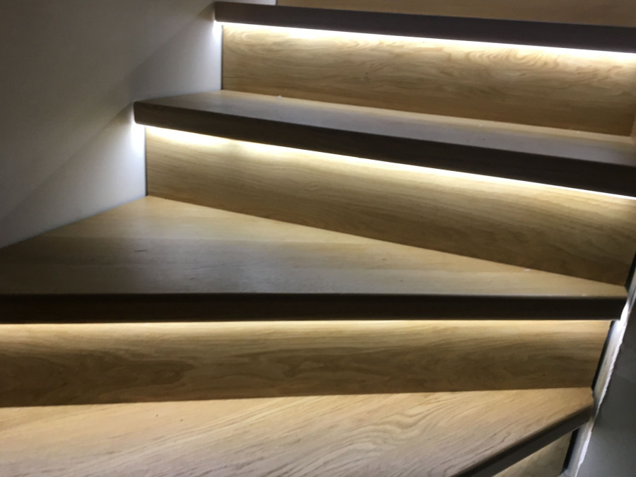 Na schodištích se často využívají zapuštěné LED bodovky instalované těsně nad podlahou, aby vymezily trasu chůze, nebo LED pásky umístěné podél schodů, pod madlem či pod nášlapnou hranou. Výhodou těchto řešení je rovnoměrné rozptýlení světla a možnost zapojení na časovač, stmívač nebo pohybový senzor. Praktické LED pásky se obecně dají uplatnit v jakýchkoli koutech bytu, kam neproniká dostatek světla z hlavního zdroje. Může jít i o šatník nebo vnitřek skříně. Na páskách oceníte jak nenápadnost a estetický design, tak úsporu energie. A navíc v interiéru navodí poklidnou, útulnou atmosféru.